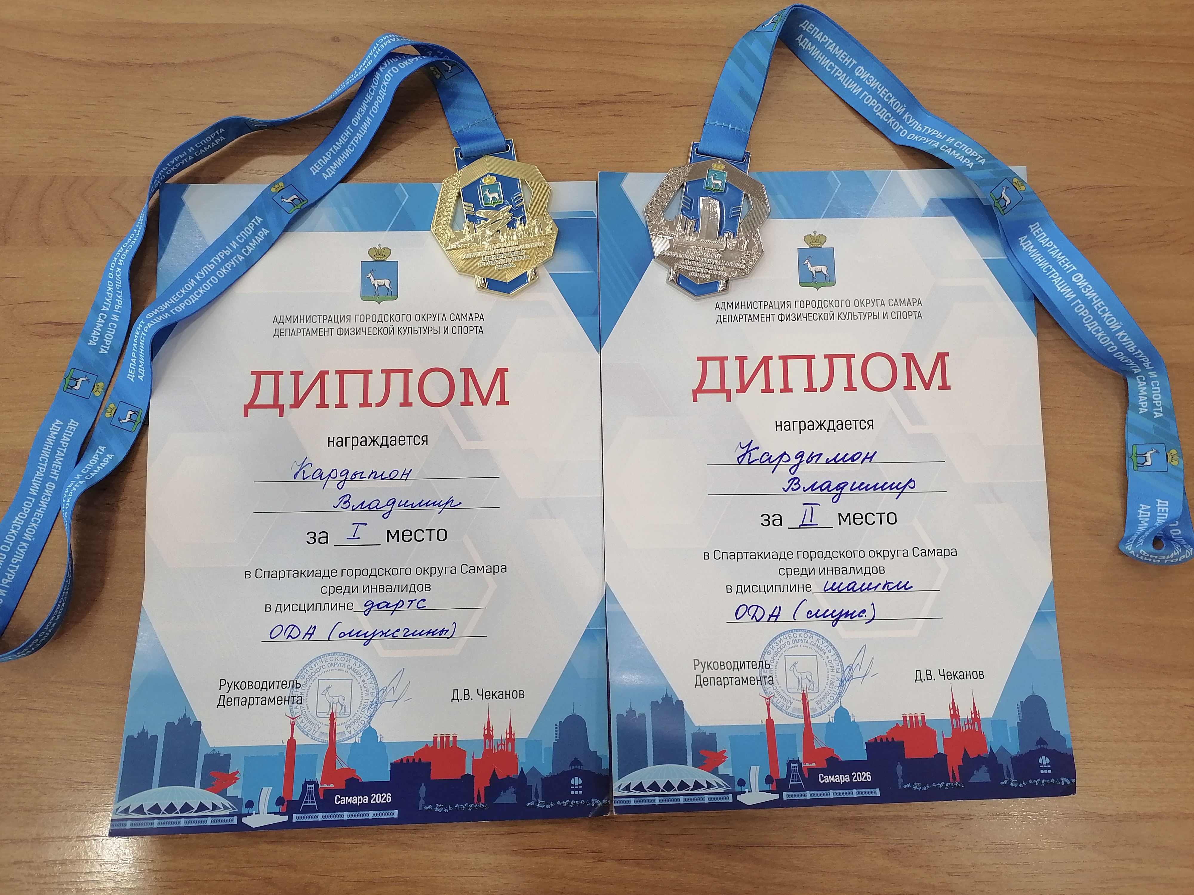 16.03.2026 в ФОК «Маяк» состоялась спартакиада городского округа Самара среди людей с ограниченными возможностями здоровья. Спортсмены-любители проявляли себя в армрестлинге, шашках, шахматах, троеборье колясочников, легкой атлетике, стрельбе, плавании, настольном теннисе и дартсе. Сотрудник Самарского районного суда г. Самары – Кардымон Владимир Евгеньевич принял активное участие в спартакиаде, и был награжден дипломами и медалями Администрации городского округа Самара Департамента физической культуры и спорта: 1 место в дисциплине – дартс, 2 место в дисциплине – шашки. Поздравляем и желаем дальнейших успехов! ![]() |